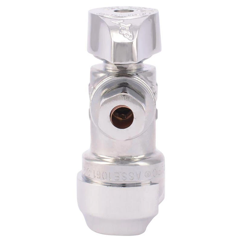 The SharkBite 1/2 inch Push-Fit x 1/4 inch outer diameter compression angle stop quarter-turn valve controls water flow to household plumbing fixtures. The angle stop valve is used where the water pipe enters the room to allow for easy shut-off of water flow to the end fixture allowing for maintenance and repair without having to turn the water off to the entire home. The SharkBite push-fit end allows you to simply push onto copper, CPVC, or PEX with no solder, clamps, unions, or glue. Just insert the pipe and the stainless steel teeth bite down and grip tight, while a specially formulated O-ring compresses to create a perfect seal. Disassembly is just as fast using the simple disconnect tool so fittings and valves can be easily changed and reused.