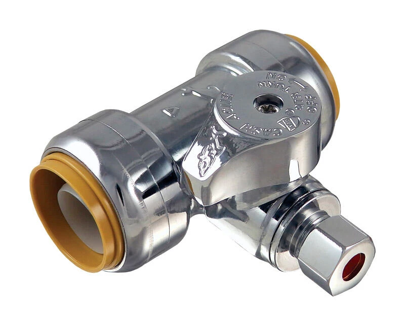The Shark Bite Tee Stop combines a Shark Bite Push-to-Connect tee with a 1/4 inch Compression line and a quarter turn valve for easy on/off control of the supply line. This product is particularly useful for adding supply lines to fixtures such as dishwashers, humidifiers and ice makers. The Tee Stop also commonly serves as an alternative to a saddle valve. It can be used on Copper, PEX, CPVC or PE-RT tubing. The valve is easily rotated after assembly for easy installation, even in tight spaces.